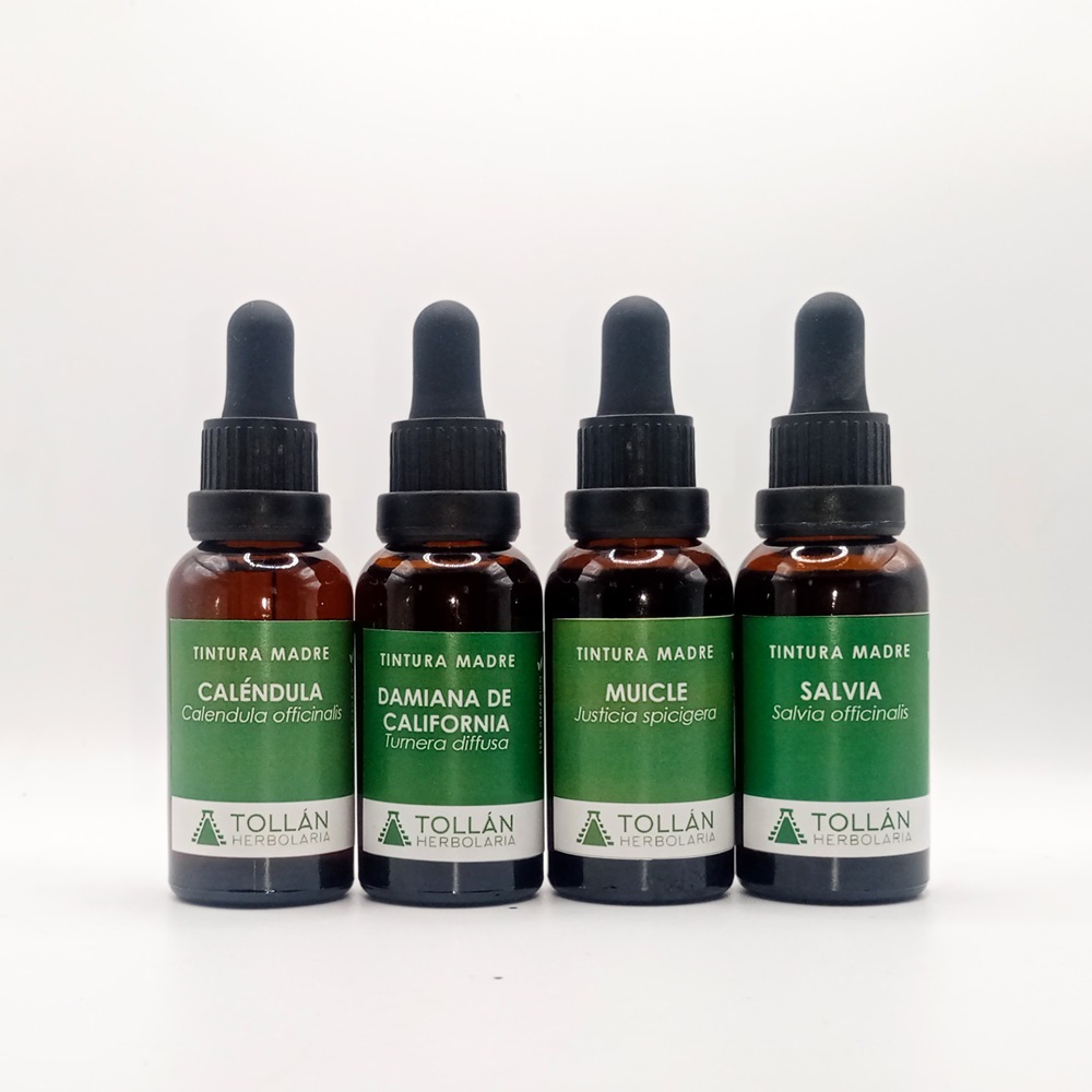 Incluye: Caléndula, Damiana de California, Muicle y Salvia (frascos de 30 ml c/u).